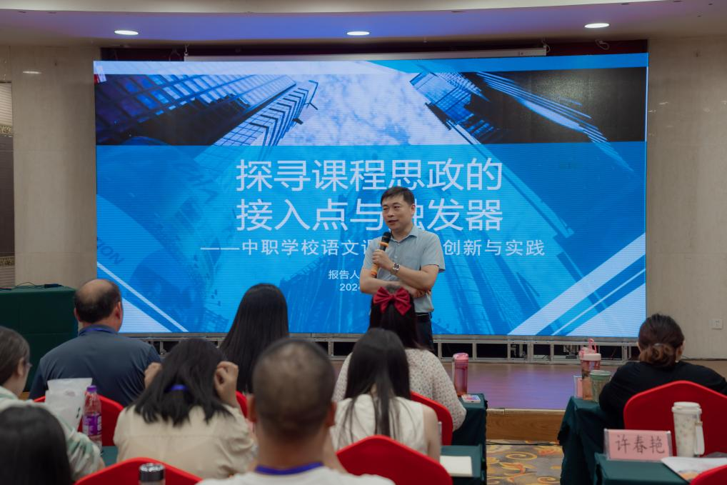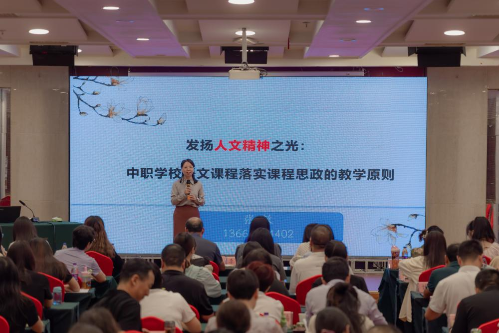 在课程思政模块还有其他专家学者的精彩讲授,张敏教授做了题为“回到历史·立足价值·聚焦审美——中职学校语文课程落实课程思政的教学原则”的演讲,指出语文教育宏观上承担着记录民族历史、传承民族文化、延续民族血脉、凝聚民族力量等重大使命,为职业学校语文课课程思政建设提出建设性意见。苏喜庆副教授强调:在中职学校的语文课程思政创新与实践中,应精准定位课程思政的融入契机与激发点,坚持以学生为中心,构建一套促进学生全面成长、贴近青年实际的课堂话语体系,有效推动课程思政的深入实施。