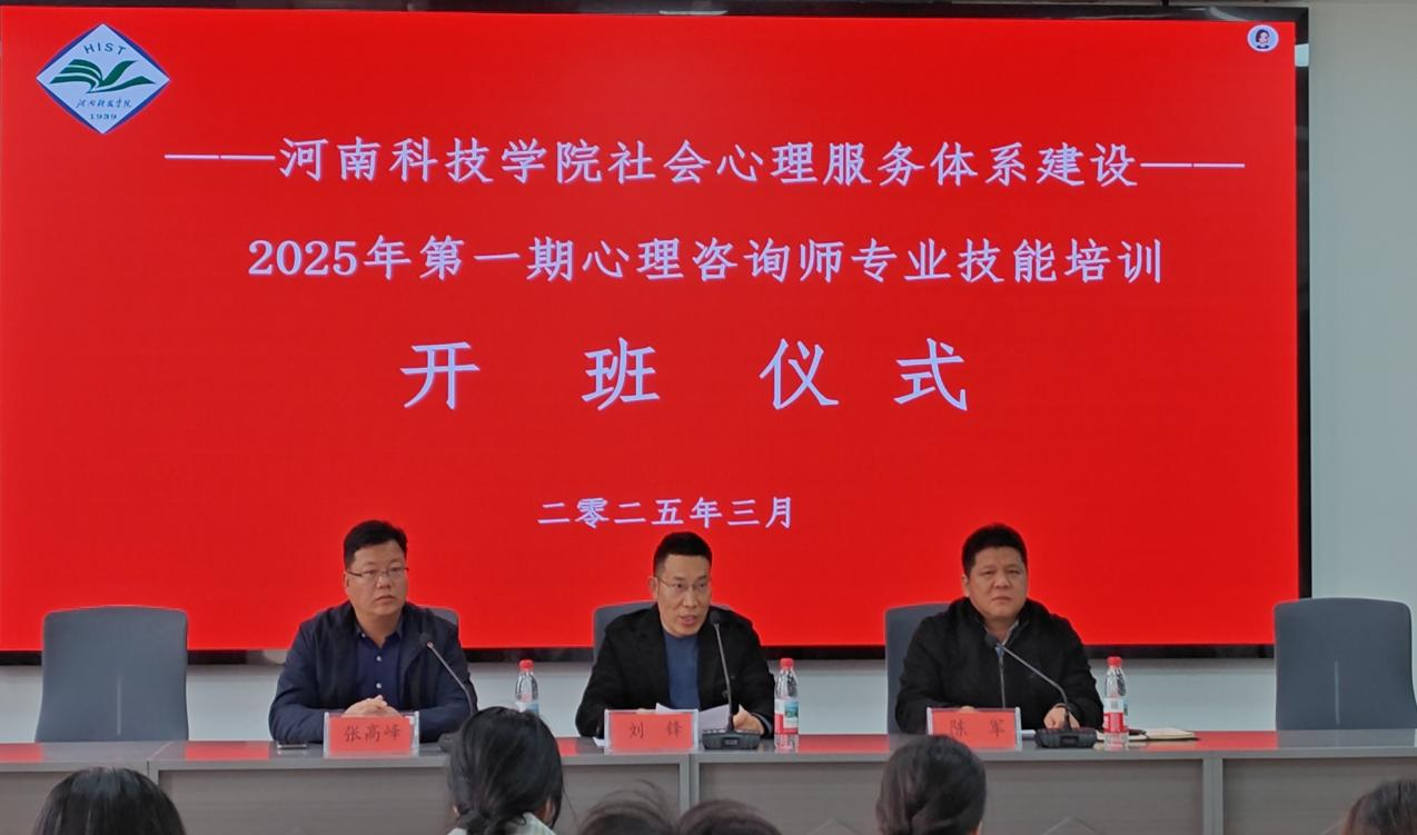 3月15日上午,河南科技学院社会心理服务体系建设--2025年第一期心理咨询师专业技能培训班在文法学院301室学术报告厅举行开班仪式,继续教育学院副院长陈军、文法学院副院长刘锋、心理咨询师专业技能培训项目负责人张高峰,本期全体学员等参加了开班仪式。开班仪式由继续教育学院副院长陈军主持。