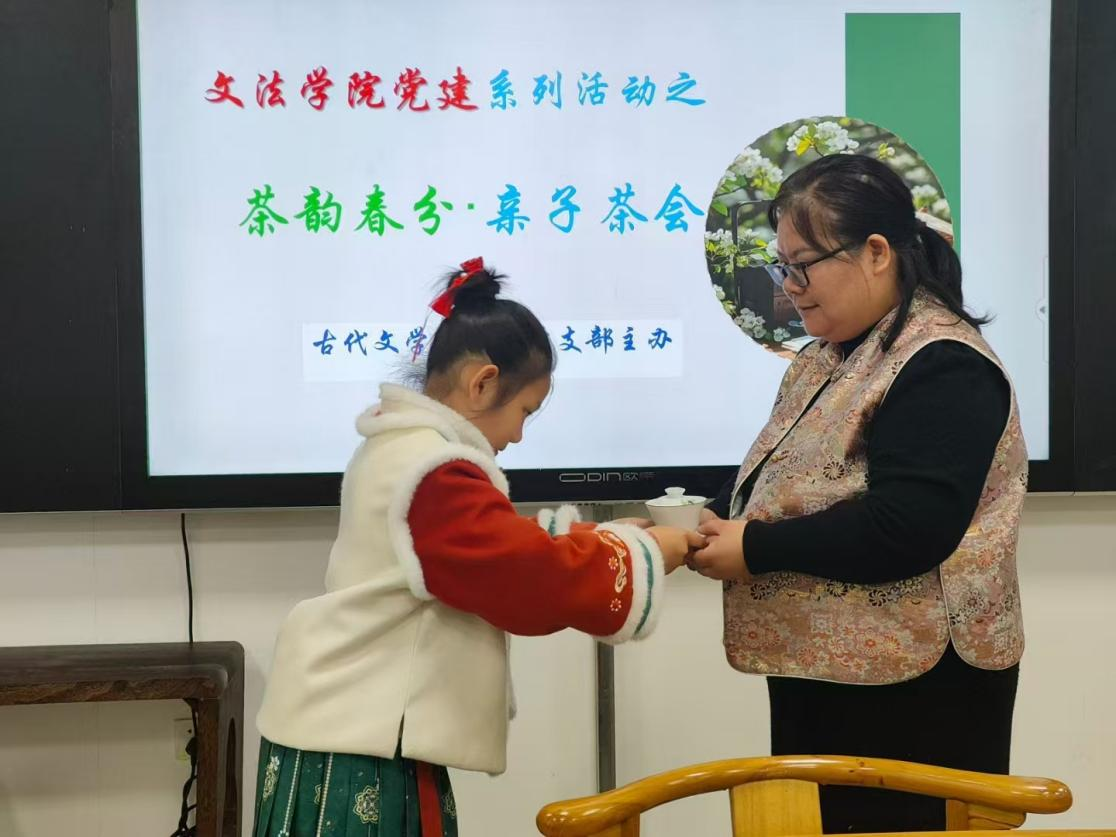 3月15日晚,文法学院茶堂内茶香氤氲,笑语盈盈,由古代文学教研室党支部主办的“茶韵春分”亲子茶会在此温馨举行。10余组教师家庭齐聚一堂,通过沉浸式文化体验活动,共赏中华传统节气之美,共话茶道人文精神传承。