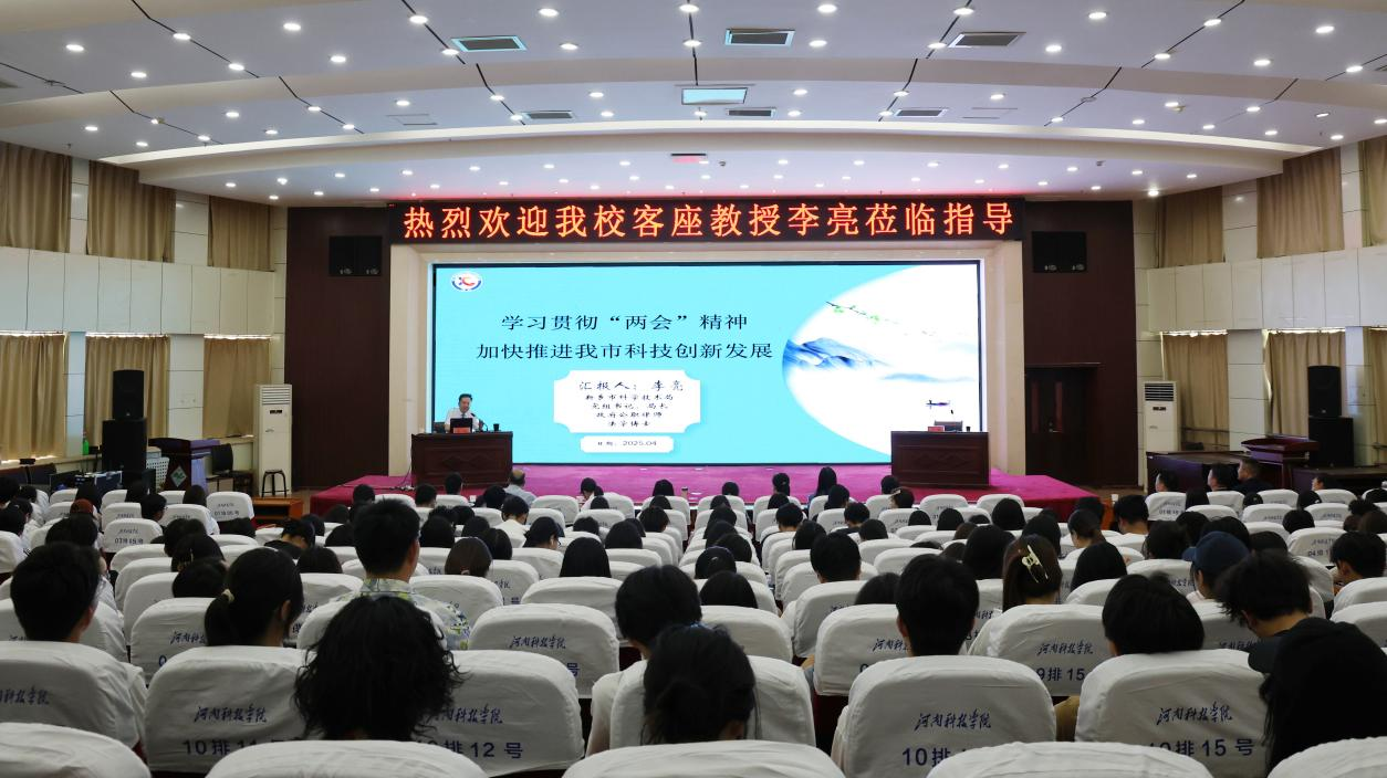 4月17日下午,我校客座教授、新乡市科技局党组书记、局长李亮博士应文法学院邀请,在行政楼308报告厅为文法学院的全体教师和学生开展了主题为“学习贯彻‘两会’精神,加快推进我市科技创新发展”的讲座。副校长丁轲出席活动,文法学院党委书记宗辉、院长张东旭以及教师和学生代表共200余人参加了此次活动。讲座由丁轲主持。