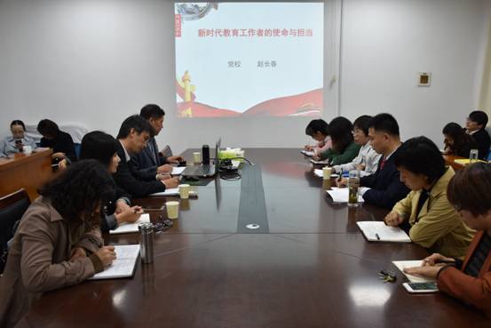 赵长春校长主要从“认真学习:开创新时代教育改革发展新局面;深刻把握:四有老师、四个引领与四个统一;提升自我:担当历史使命”三点切入梳理概括了党的十八大以来习近平总书记关于教育的重要论述。着重阐释了“全面贯彻党的教育方针,深刻理解立德树人的根本任务”,他说:“互联网+”时代,对教师提出了新的要求,我们要努力更新知识结构,为民族培养担当时代大任的接班人。发挥学生的主观能动性,教师言传身教的作用非常大。从人才培养到科学研究、社会服务,再到文化的传承创新,随着大学的功能不断延展、丰富,教师的使命越来越重大。我们要不忘初心、牢记使命、砥砺前行。