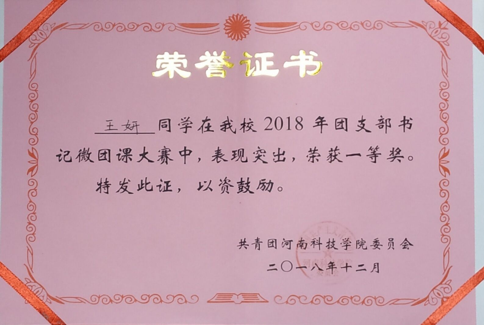 12月7日,由校团委主办、教育科学学院承办的2018年团支部书记微团课大赛在图书馆一楼报告厅举行。凭借真挚、朴实的语言和精彩的讲说,学前教育173班王妍同学获本次比赛一等奖。