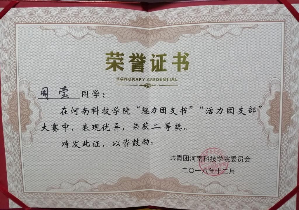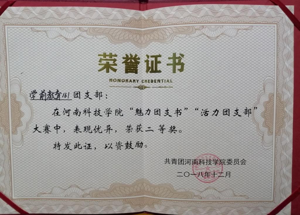 凭借扎实的工作作风、良好的精神风貌以及强烈的服务意识,我院学前教育161班学生周莹在16位候选团支书中脱颖而出,荣获“魅力团支书”称号,其所在团支部荣获“活力团支部”称号。