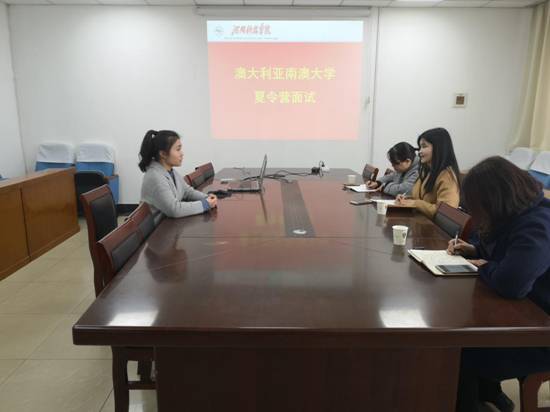 面试按照学生自我介绍、评委提问、学生应答等程序进行。评委老师认真听取面试人员的自我介绍并对学生进行提问。针对所提问题,参加面试的同学就自己未来职业、出国留学意向等方面内容进行了阐述。评委老师从作答表现、英语水平等方面对面试学生进行综合评审。经过选拔,最终有13名学生脱颖而出,获得参加“南澳大学夏令营”的资格。