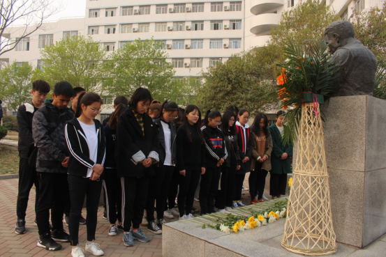 4月4日上午7时,20余名团员在黄光正教授雕像前,肃立默哀一分钟。认真聆听教授先进事迹,敬献亲手制作的花朵,鞠躬致敬。