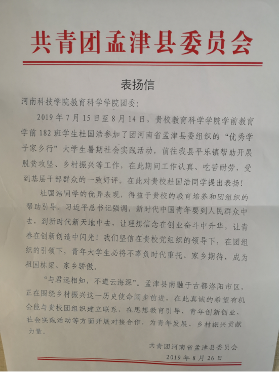 近日,我院团委收到了一封来自共青团孟津县委员会寄来的表扬信,信中对我院学前教育专业18级学生杜国浩同学参加孟津县委组织的“优秀学子家乡行”大学生暑期社会实践活动表示感谢。信中称:“杜国浩同学前往孟津县平乐镇帮助开展脱贫攻坚,乡村振兴等工作。在此期间,工作认真,吃苦耐劳,受到基层干部群众的一致好评。”同时感谢学校学院的教育培养。
