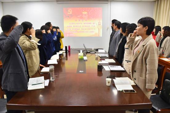 会议在嘹亮的国歌声中拉开帷幕,学生第一党支部书记卢璐洁作为领誓人,带领与会党员重温入党誓词。