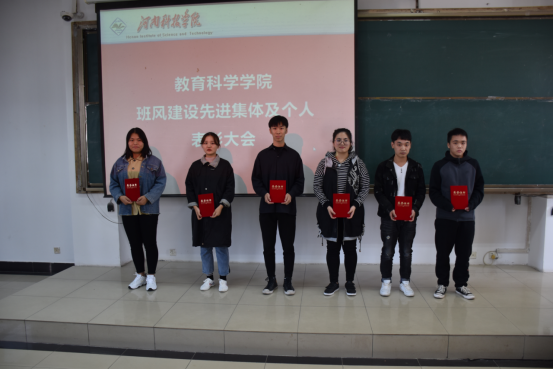 会上,院团委书记熊慧娟宣读表彰决定,表彰班风建设先进班集体6个,优秀班干部、学习标兵、优秀寝室长、活动积极分子、三好学生等先进个人118人。随后,与会老师为获奖班级颁奖。受表彰学生代表教育学(中外)174班王娅西、教育学182班蒋清雅、教育学(中外)182班苏柳杨依次上台发言,畅谈在班级建设中的收获与成长,并以自身为例劝诫同学们要加强自我管理,提高主观能动性。会议最后,李威作总结讲话。他对获奖班级和个人表示热烈祝贺,并对受到表彰的集体和个人进行了原因分析,强调班风建设的重要性,希望同学们能够进一步端正态度,改进学习方法,提高学习效率,建设优良的学风、班风。