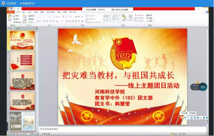 为深入贯彻落实省教育厅在全省教育系统中开展“把灾难当教材,与祖国共成长”主题教育活动精神,引导团员青年肩负起新时代青年使命和义务,以实际行动为抗击疫情出力助力。3月30日—4月3日,我院组织全院各团支部开展了“把灾难当教材,与祖国共成长”线上主题团日活动。活动由各团支部书记主持。