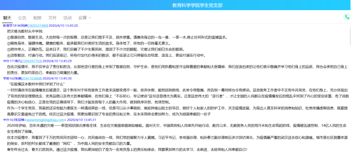 党日活动中,全体学生党员一起观看了《习近平出席二十国集团领导人应对新冠肺炎特别峰会并发表重要讲话》视频。随后,学生第一党支部宣传委员杨慧和学生第二党支部宣传委员王艺分别领学了“中国特色社会主义制度的优势”和“党旗在疫情防控斗争第一线高高飘扬”等重要内容。支部党员围绕“在‘疫情’这本教材中学到了什么”进行积极发言。学生第一党支部党员黄慧谈到,通过这次战“疫”懂得了作为学生党员一定要更加有责任、有担当,做胸有大志、心有大我、肩有大任、行有大德的青年,做合格的社会主义建设者和接班人。学生第二党支部党员张康宁说,通过这次疫情不仅充分体会到了爱国主义情怀和高尚的道德品质,更看到了中国共产党带领的中国人民在战“疫”中所展现出的中国速度、中国力量和中国精神。