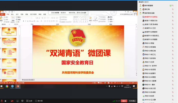 4月15日,我院开展 “国家安全教育日”线上主题微团课活动。此次团课由院团委书记熊慧娟主讲,各团支部书记30余人参加学习。熊慧娟围绕“何为国家安全”“当前国际国内形势”“危害国家安全的行为及相关罪名”等方面进行讲解。并针对“如何维护国家安全”“谁来保卫国家安全”等问题进行详细解读,希望各团支部书记认真学习国家安全教育相关知识,不断提高自身综合素质,为维护国家安全贡献自己的力量,做一名合格的当代大学生。