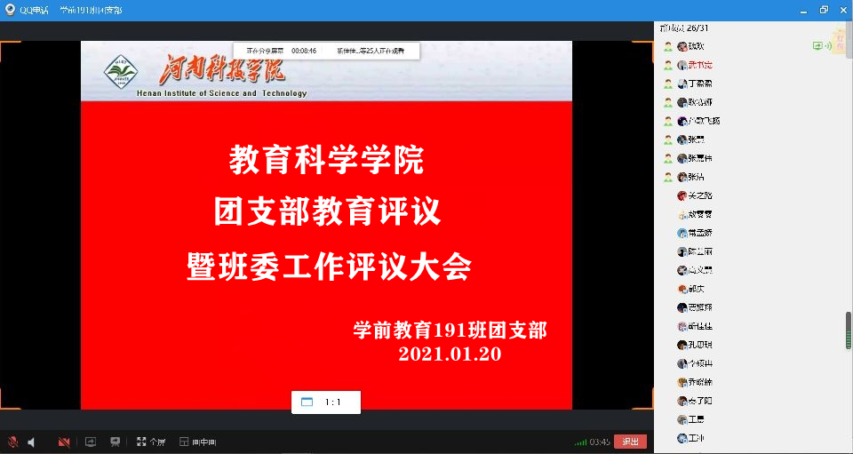 为切实加强团的组织建设,进一步深化基层团支部规范化建设,增强各团支部的组织力和战斗力,广泛提高学生自身的思想道德素质。1月19日至1月21日,我院组织各团支部开展2020年度团支部教育评议暨班委工作评议活动。活动由各团支部书记主持,支部全体成员参加会议。