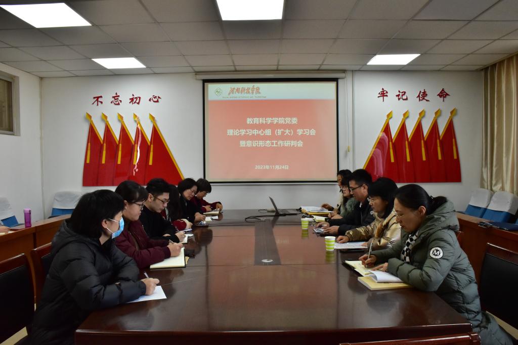 11月24日下午,教育科学学院在0号楼1008会议室召开党委理论学习中心组(扩大)学习会暨意识形态工作研判会。学院党政班子成员、党支部书记,党务、教学、科研、研究生秘书,辅导员及教研室主任参加会议。