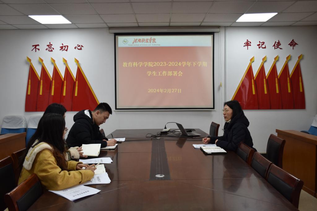 2月27日下午,教育科学学院在0号楼1008会议室召开2023-2024学年第二学期学生工作部署会,学院党委副书记李鹏、全体辅导员参加会议。