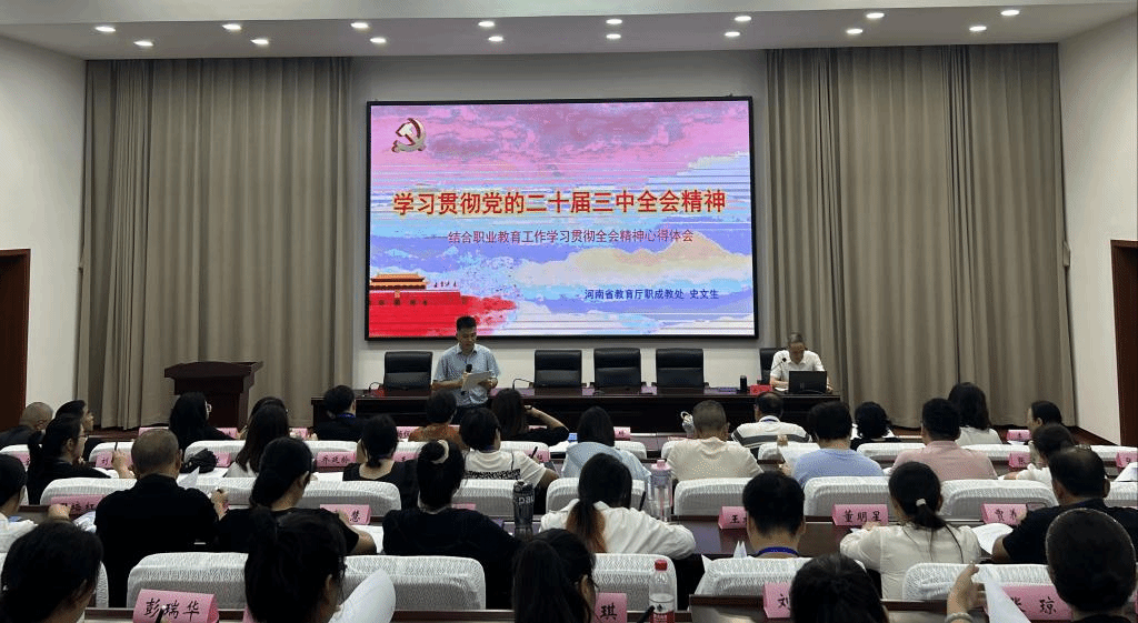开班仪式结束以后,河南省教育厅职成教处一级调研员史文生教授以《学习贯彻党的二十届三中全会精神—结合职业教育工作学习贯彻全会精神心得体会》为题,给培训班学员作了首场报告。