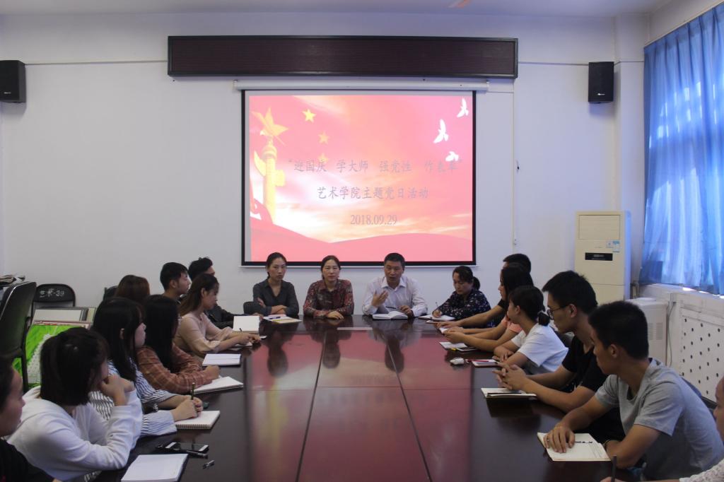 为庆祝中华人民共和国成立69周年,9月29日,艺术学院党委在11号楼208会议室举办“迎国庆、学大师、强党性、作表率”主题党日活动,艺术学院党委书记张玉新、副书记徐小玉、团委书记刘凤、正科级辅导员左玉含及学生党员、入党积极分子共二十余人参加了活动。