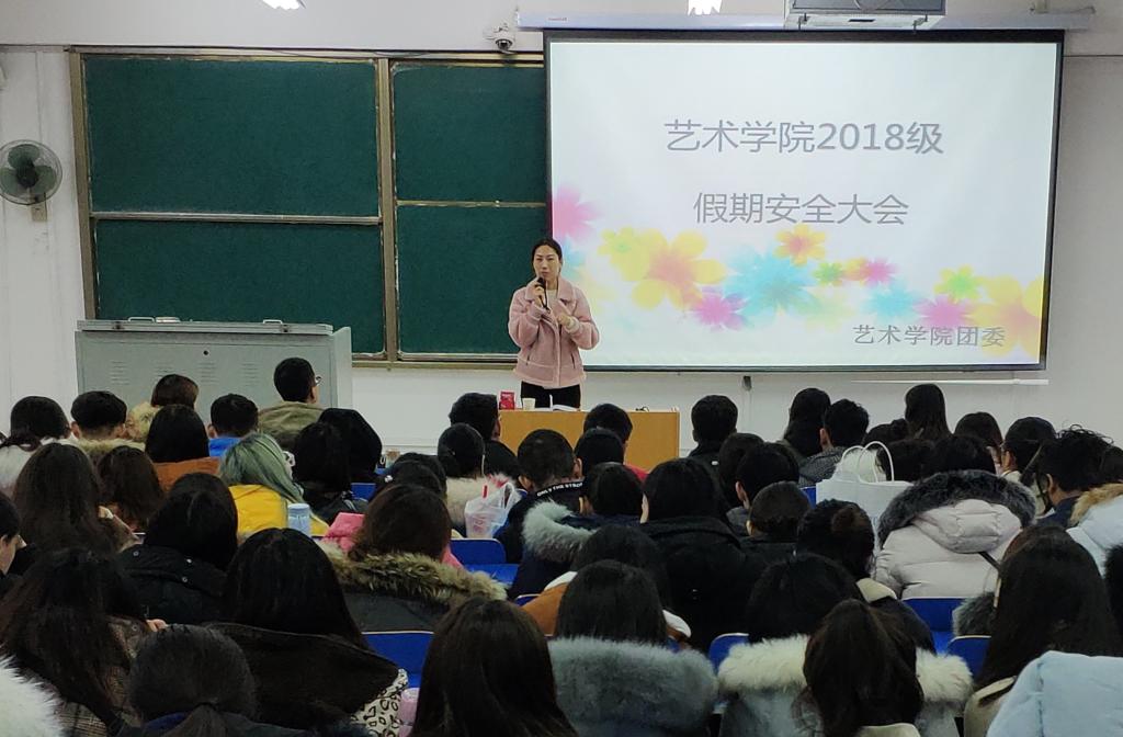 为加强学风建设,严肃考风考纪,帮助同学们养成诚实守信的良好品德,增强安全防范意识,12月27日中午艺术学院在8号楼合二教室举办“秉持诚信初心,决战零挂科”考前动员大会暨假期安全教育会,艺术学院正科级辅导员左玉含、2018级年级长、高年级优秀学生代表及2018级全体学生共300余人参加了本次大会。