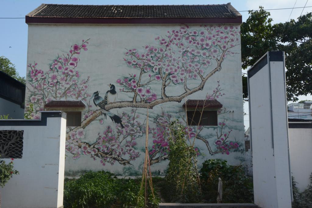 第一站,实践队员们来到长垣县南浦办事处云寨村,穿梭于云寨村的各个小巷中,映入眼帘的便是各式各样的宣传标语和墙体绘画。特别是以植物命名的街道两边,随风飘摆的红花绿叶与惟妙惟肖的墙体彩绘交相辉映,使人仿佛来到了主题乐园一般,村民自豪的向队员们介绍到:“俺们云寨村里的街名叫啥,这街两边就种啥,街里的房屋墙上就画啥。”村民还指着身后的漂亮房子介绍到:“恁看这些房子,以前还都是土坯房,现在可不一样了,村干部给俺们开会教俺们开民宿,俺们现在是在家门口就能赚大钱嘞。”说完热情地塞给队员们名片:“恁拿着名片,来俺这住俺给恁优惠。”