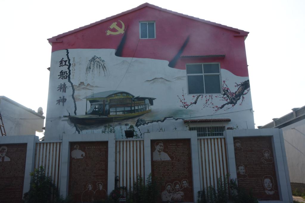 广场西北角处的“红船”在浙江嘉兴南湖背景墙的映衬下格外引人注目,与之相应的是红军长征路线图、《七律•长征》及遵义会议的石刻板墙,广场正中间是一面红色的党旗,在24字核心价值观景观石刻的映衬下熠熠生辉。围绕着广场边有一处正在修建的建筑:上官村老人活动中心,据村干部介绍,老人活动中心是由村委会牵头修建,预计月底建成,可供村中老人进行文娱休闲活动,并提供食宿,是解决村中养老问题的一大举措。