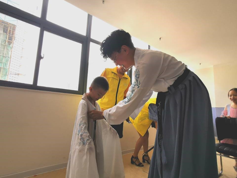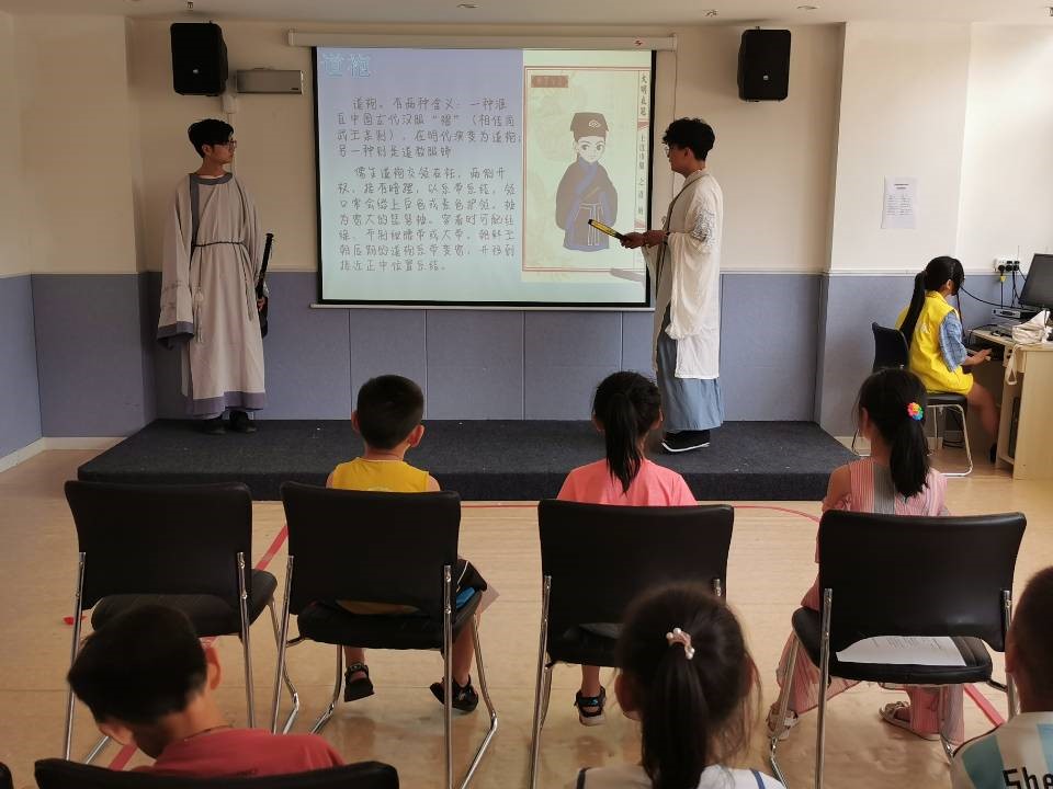 7月6日,中华传统文化宣讲团前往浦光社区开展“汉服讲座”活动,实践队员们刚到实践地点,孩子们便一眼注意到了队员们身上穿着的汉服,马上好奇地围了上来,眼睛里闪烁着好奇与惊喜的目光,:“哥哥、哥哥,你们是古代穿越过来的吗?”还没等队员们解释,另一个小朋友便拉着实践队员们的衣角反驳道:你说的不对,哥哥姐姐们明明是在拍戏。”清澈的眼神,活泼的话语一下子融化了实践队员们的心。活动开始,实践队员们向孩子们亲切地进行了自我介绍,并向小朋友们全方位地展示了身上所穿的汉服,精致的纹饰,飘逸的丝带,华美的广袖深深地吸引住了小朋友们的注意,随后队员们通过PPT展示,从汉服的起源、礼制、特点等方面向孩子们详细讲解汉服和汉文化。课堂上孩子们听得格外认真,还时不时主动举手提出自己的疑惑,实践队员们也详尽地为孩子们作答。为了让孩子们更能亲身体验到汉服文化的魅力,课上特别加入了试穿环节,在实践队员们的帮助下孩子们小心翼翼地穿上汉服,试穿过后孩子们激动地向实践队员们分享自己身着汉服的感受。实践队员们还及时补充了穿汉服时的注意事项,让孩子们对汉服文化有了更全面、更深刻的认识。