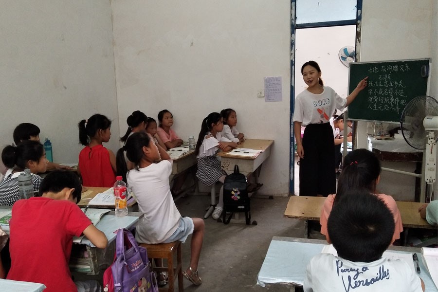 7月9日,中华传统文化宣讲团走进河南濮阳大岳村小学进行红色诗词文化宣讲活动。实践队员们刚到濮阳大岳村小学,还来不及休整,便赶紧在简陋的教室里进行了一番简单的布置,并提前在黑板上为同学们抄写上毛泽东的《七绝改诗赠父亲》,迎接孩子们的到来。“孩儿立志出乡关,学不成名誓不还。埋骨何须桑梓地,人生无处不青山。”实践队员们带着孩子们一起大声朗诵。朗诵结束后,实践队员们向孩子们详细介绍了《七绝改诗赠父亲》这首诗的写作背景以及所表达的思想感情,加深孩子们对诗句的理解,感受红色革命、爱国情怀。课上,孩子们主动提出对于诗词中不理解的地方,志愿者一一为孩子们解答疑惑。“老师,我可以站起来单独朗诵这首诗吗?”原来这个小男孩的爷爷从小就教他学习红色诗歌。除此之外,他的爷爷也经常给他讲中国共产党革命战士的优秀事迹。家庭的耳濡目染使他非常热爱红色经典文化,他希望自己也可以为弘扬中国文化贡献一份力量。