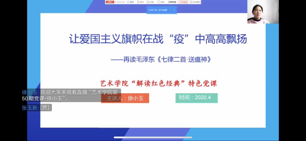 4月23日晚上,因为受疫情影响,艺术学院以钉钉平台直播的形式举办了以《让爱国主义旗帜在战“疫”中高高飘扬——再读毛泽东<七律二首·送瘟神>》为题的第35期解读红色经典特色党课活动。本次特色党课由艺术学院党委副书记徐小玉主讲,艺术学院入党积极分子共计60余人收看了党课直播。