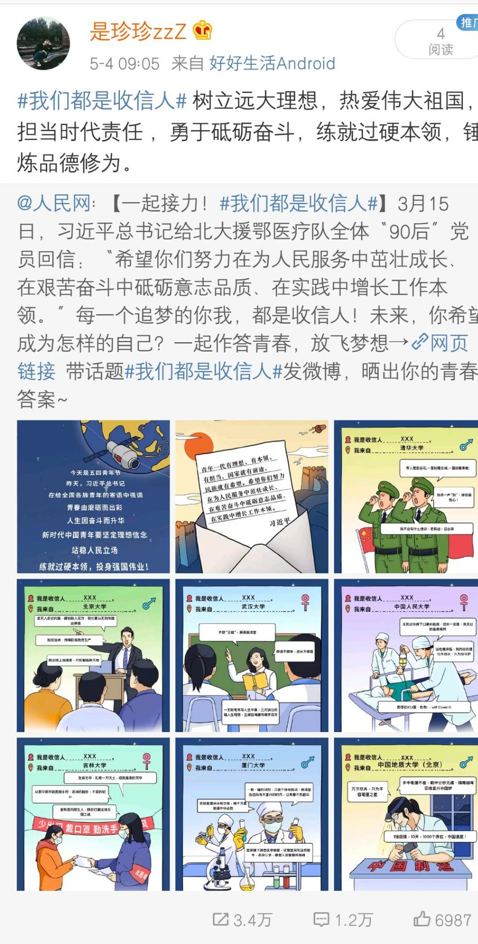 艺术学院组织团员青年积极参加团中央在微博、微信、B站、快手、抖音、斗鱼、今日头条等各大网络平台同步直播的“让青春为祖国绽放光彩”网上主题团日活动和教育部思政司属、人民网新媒体微信平台推出的“我们都是收信人”主题活动,再次认真开展学习贯彻习近平总书记给北京大学援鄂医疗队“90后”党员重要回信精神。活动过程中,同学们准时进行直播收看,认真记录笔记,转发活动相关微博,参与评论互动,并在活动结束在团支部内部组织学习感悟分享交流会。