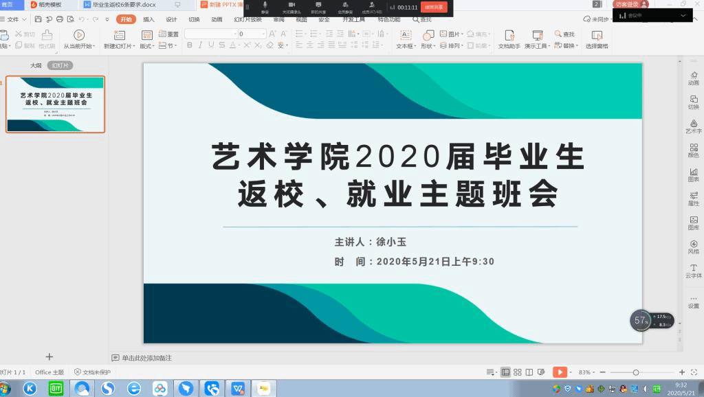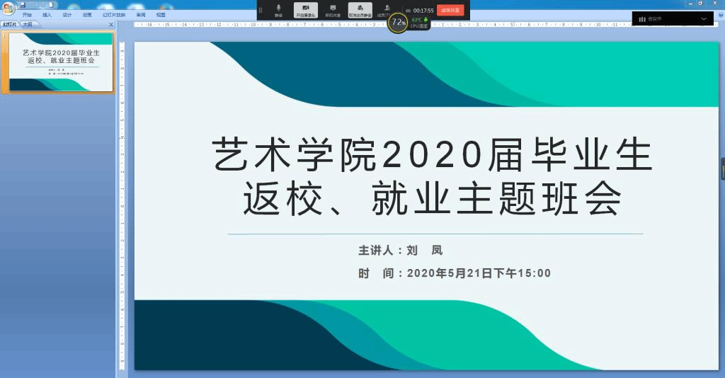 为进一步做好毕业生返校相关工作,服务毕业生就业工作,5月21-22日,艺术学院党委副书记徐小玉和团委书记刘凤通过视频会议的方式,分批次召开了艺术学院2020届全体16个班级的复学、就业主题班会。