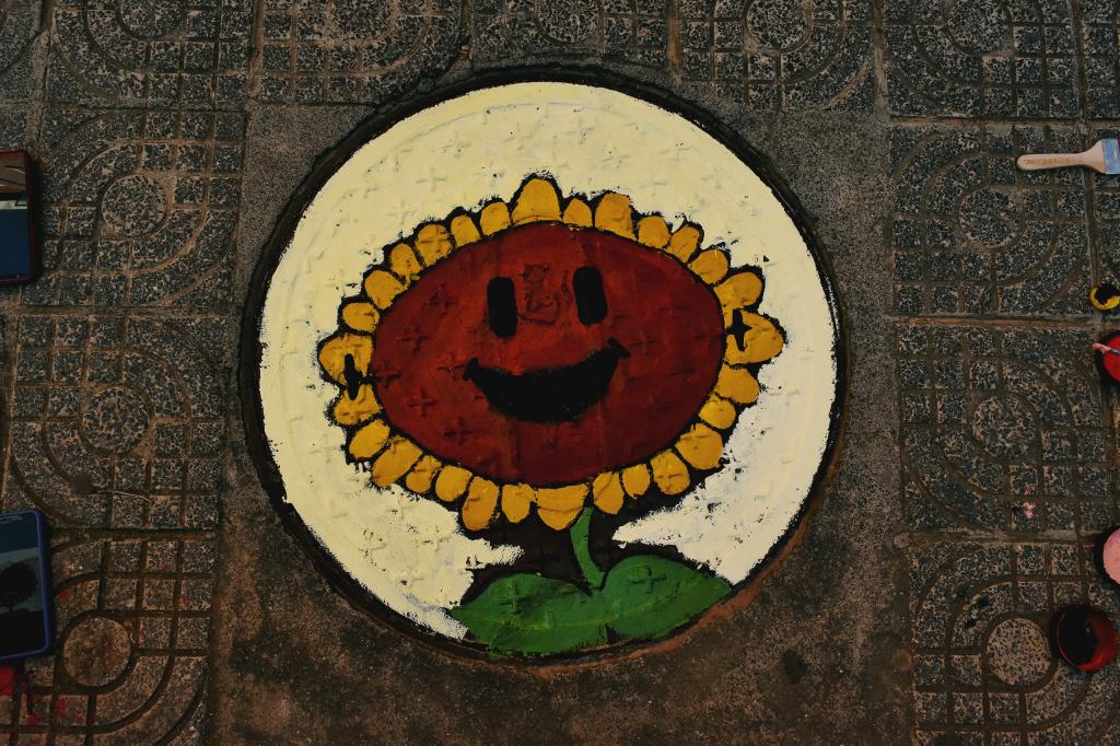 在常态化疫情防控背景下,艺术学院学子们带着刚刚重返校园的欣喜和激动之情,积极投身校园文明创建。志愿者从设计和选择草图样本,再到勾勒图案、填充颜色等各个环节都一丝不苟,认真对待,他们或三个一簇、四个一组,清理、调色、打形、上色,分工合作、密切配合,通过绿树、向日葵及各种卡通图案,用大家喜闻乐见的形式为学校绘出了与众不同的“景”,给予了广大师生温馨的安全提醒。色彩靓丽、活泼可爱的井盖涂鸦还引来了许多师生和小朋友们驻足观看,夸赞连连。