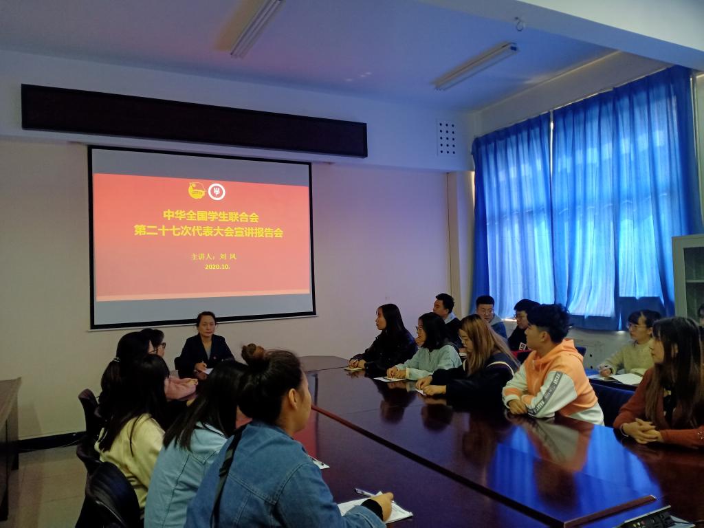 为深入学习贯彻落实中华全国学生联合会第二十七次代表大会会议精神,深刻领会习近平总书记贺信精神实质和深刻内涵。10月17日,艺术学院在11号楼208会议室组织学习全国学联二十七大精神,艺术学院团委书记刘凤和部分团学干部30余人参加了本次活动。
