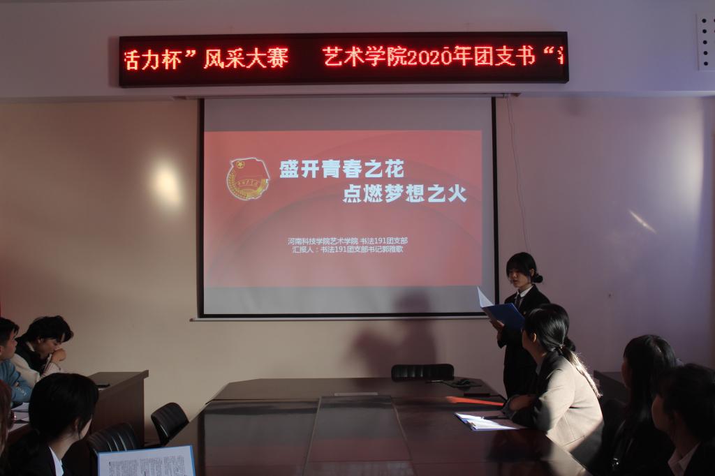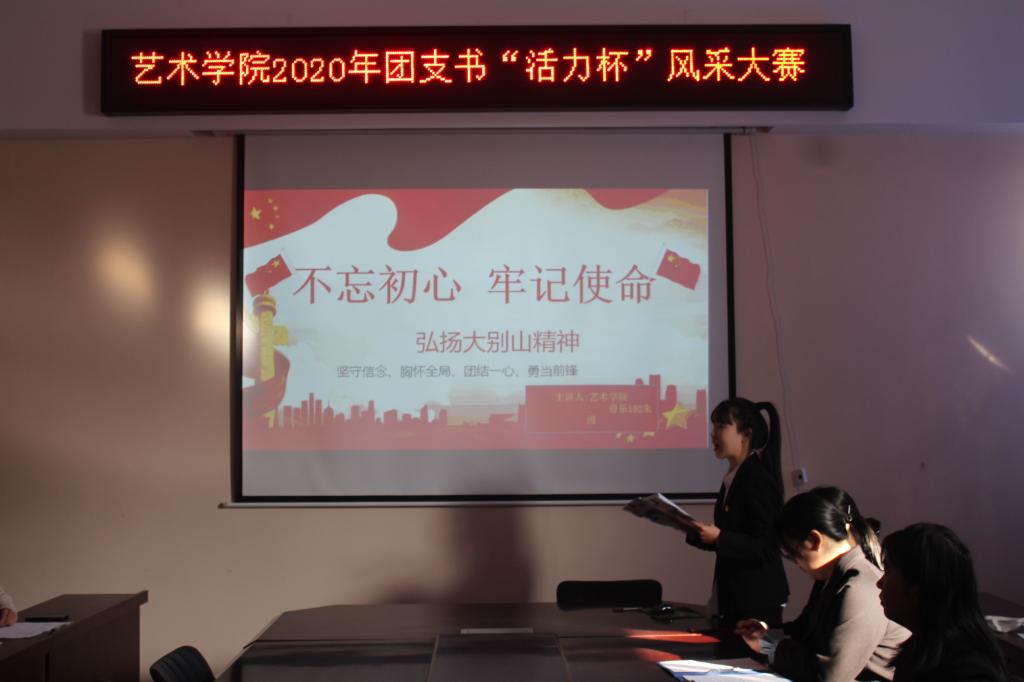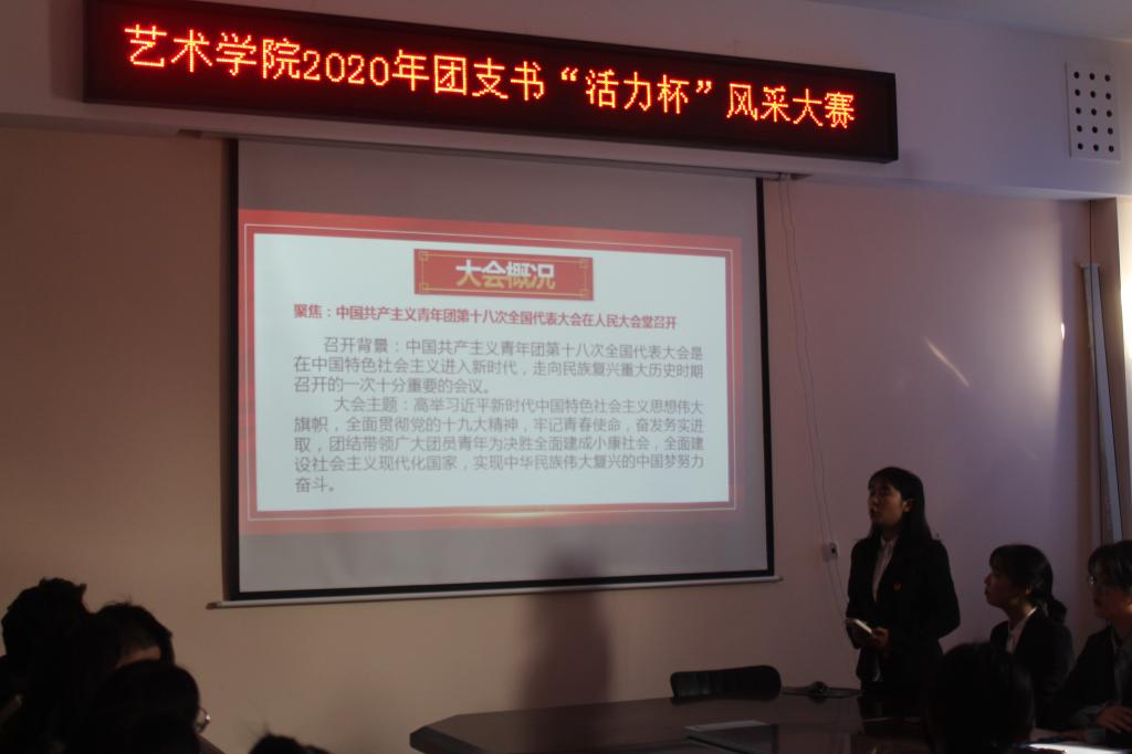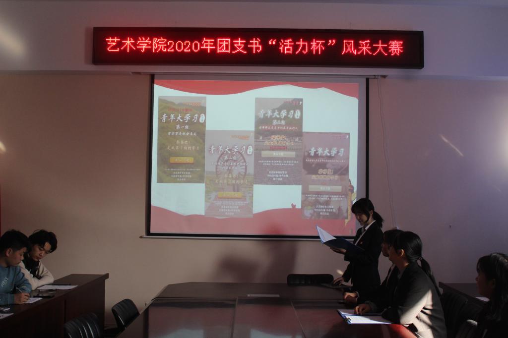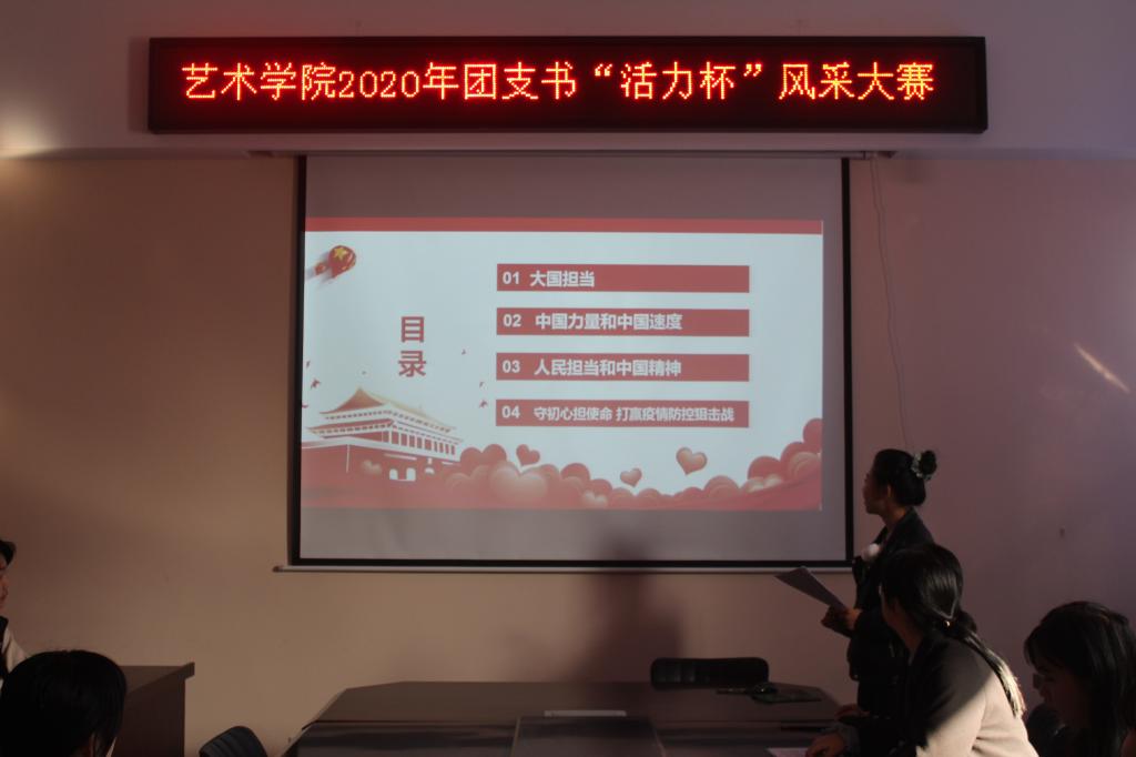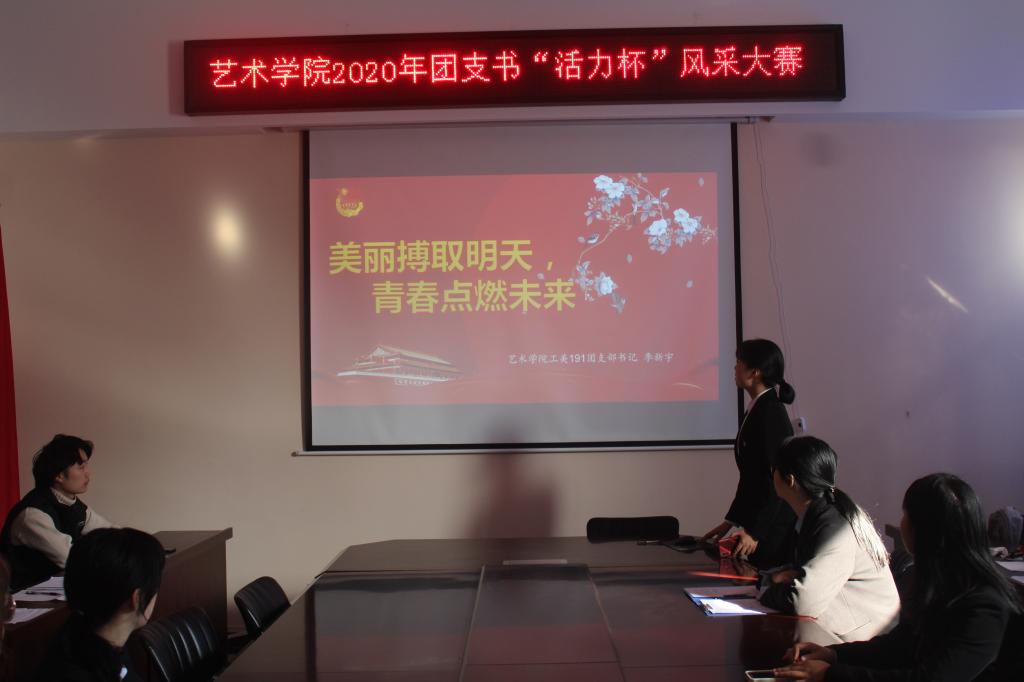 为增强团组织的影响力与凝聚力,加强艺术学院各基层团支部建设,11月8日中午,艺术学院在11208举办2020年团支书“活力杯”风采大赛。艺术学院团委学生会主席团以及组织部部长刘怡林、创新实践部部长李雯晴、19级各团支部学生代表参加了本次活动。活动由创新实践部干事任月秋和组织部干事郭辰轩主持。