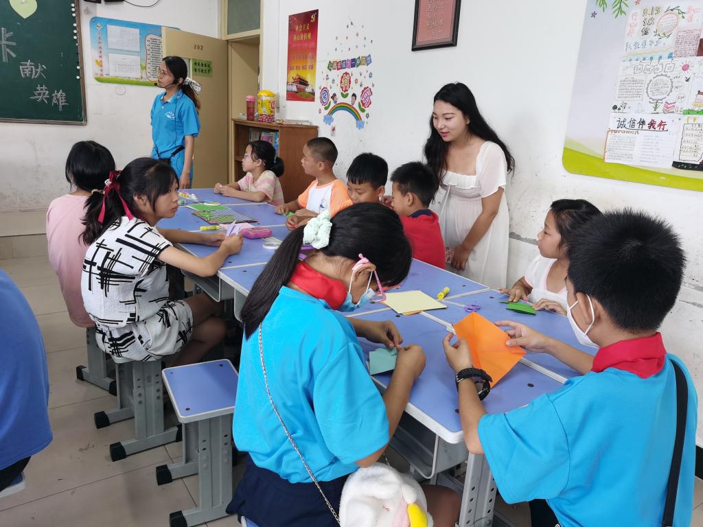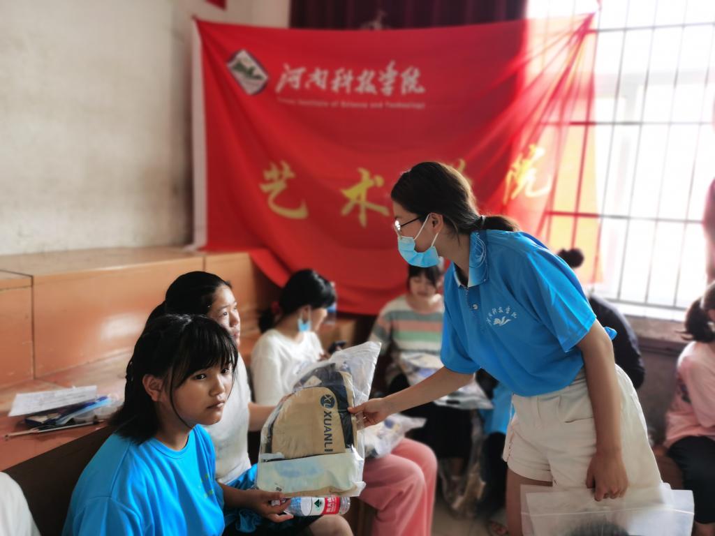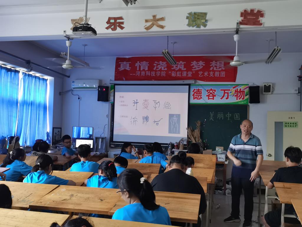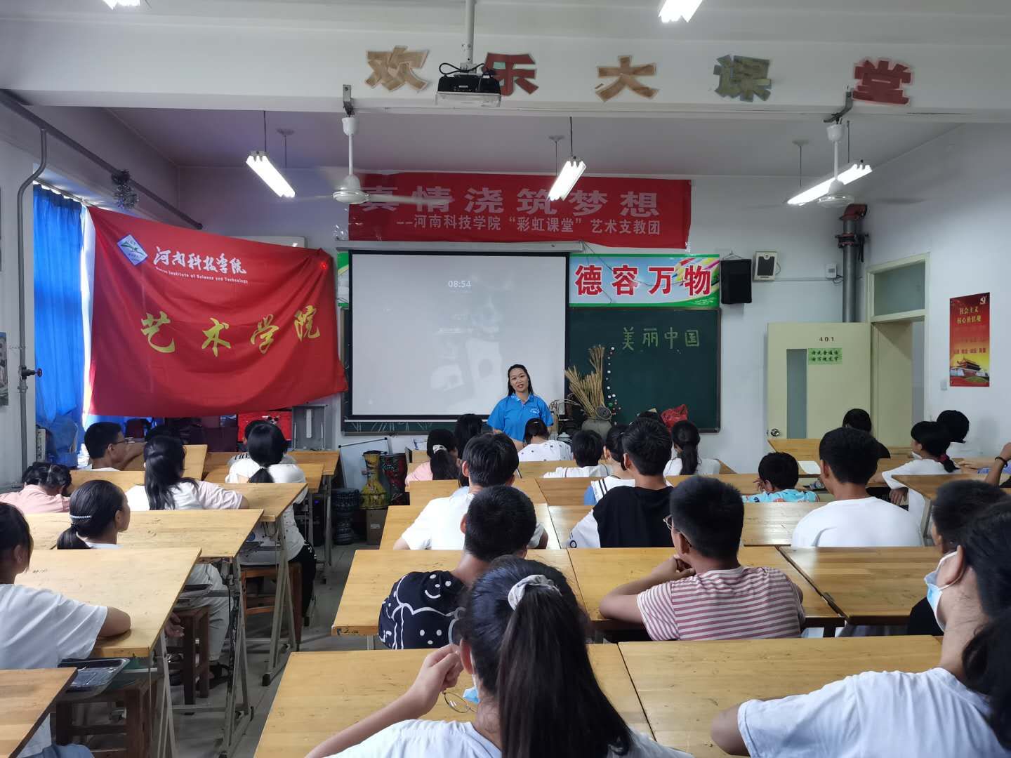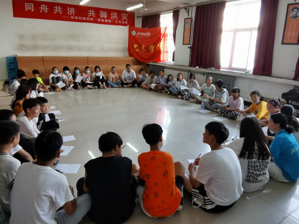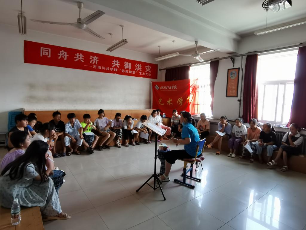 为切实做好艺术支教工作,学院结合学生实际,根据制定的《“同舟共济、共御洪灾”河南科技学院转移安置点“彩虹课堂”课程教学活动方案》统筹安排好每一节课程。在为期六天的艺术支教活动中,学院党政领导坚持每天跟班,辅导员张腾玮、刘凤负责学生课前课后的安全接送工作。在保障学生安全的前提下,学院老师们给学生带来了丰富多彩的课程盛宴,其中张新词院长给学生讲授《遇见甲骨文》,郝好燕老师讲授《美丽中国——色彩风景》,王奇男老师讲授《动画鉴赏与分析》,熊秋玲老师给孩子们带来《音乐游戏》,宋德玉老师讲授《八月桂花遍地开(分声部节奏击打演唱)》,黄雪玉老师辅导小朋友们做手工。六天的课程里,学院党政领导、学院教师及学生助教们尽职尽责,尽自己最大努力用艺术助力孩子们健康快乐成长。