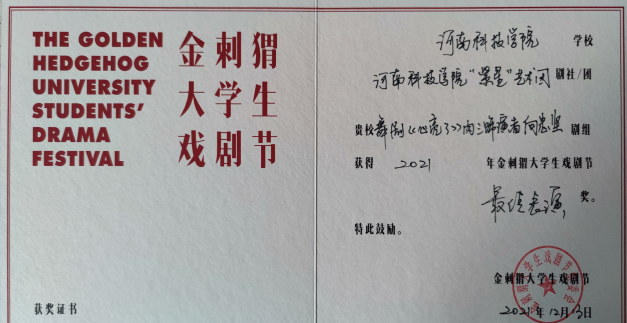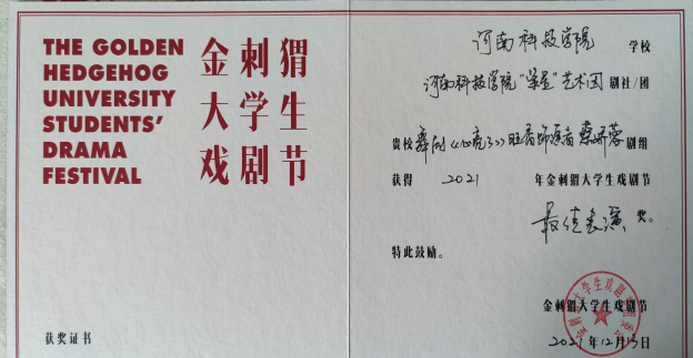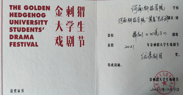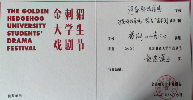 由北京市朝阳区文化和旅游局、北京戏剧家协会主办、北京市朝阳区文化馆、新京报社承办的2021金刺猬大学生戏剧节,经过评委会投票及组委会核定,在最终线上展演的10部作品中,我院原创舞剧《心亮了》荣获2021金刺猬大学生戏剧节优秀剧目奖、最佳演出奖、最佳表演奖、最喜爱人气剧目奖等多个奖项。