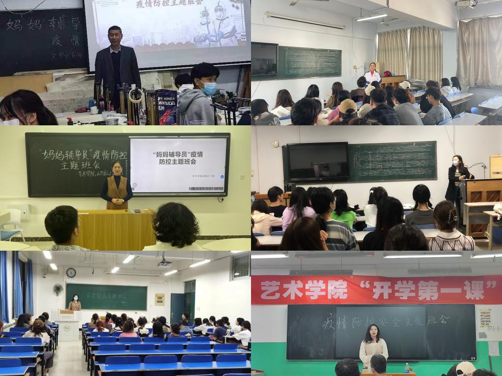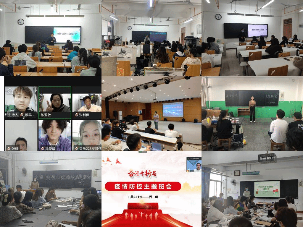 9月27日-10月14日,艺术学院全体“包班联点”教师严格按照学校各项疫情防控工作规定,陆续召开了校园安全稳定暨疫情防控主题班会,提醒同学们:一要绷紧疫情防控这根弦,严格遵守学校疫情防控各项规定,做好个人防护;二要加强宿舍安全防范意识,严禁使用违章电器,注意防火及用电安全;三要强化网络安全意识,守法用网、文明上网,营造健康文明的网络环境;四要志存高远、脚踏实地,学好知识,打好基础,增长才干,科学合理规划大学生活。