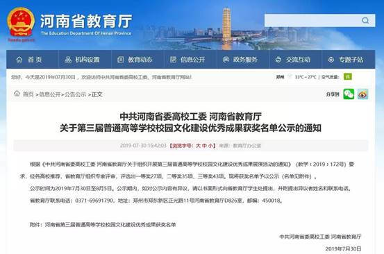 2019年7月,省委高校工委、省教育厅对第三届河南高校校园文化建设优秀成果获奖名单进行了公示,我院“服饰文化节”代表学校参评,并获得二获奖。