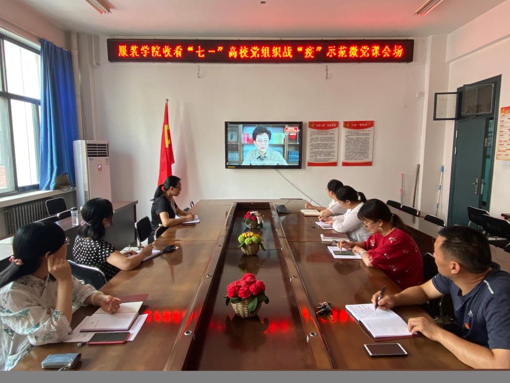 为纪念伟大的中国共产党成立99周年,深入学习贯彻习近平新时代中国特色社会主义思想和党的十九大精神,根据学校要求,立足当前疫情形势,7月1日上午,服装学院组织在学院会议室收看“七一”高校党组织防“疫”示范微党课,学院党政领导、党支部书记和党支部委员参加了微党课学习。