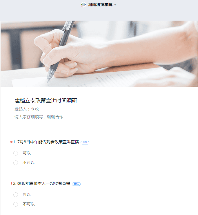 为了使资助政策宣传到每一位建档立卡学生,李牧老师通过在钉钉软件中的“智能填表”,对全院所有建档立卡学生进行了摸底,用问卷的形式了解学生及家长能否按时参加直播宣讲活动,并约定时间通过钉钉直播宣讲资助政策。