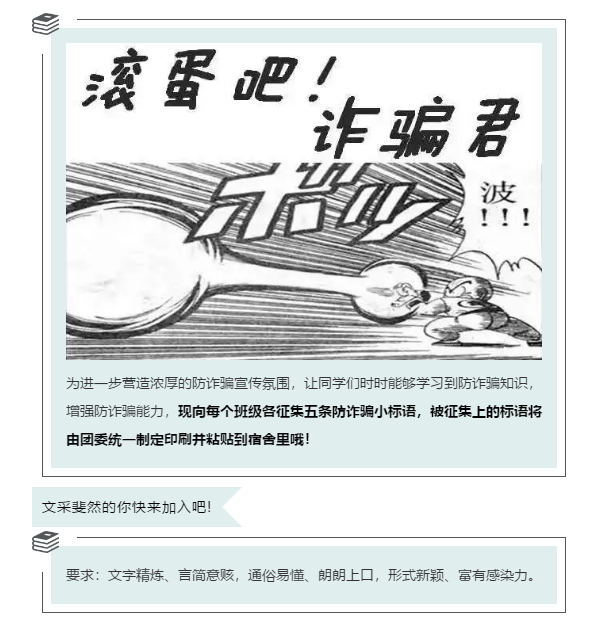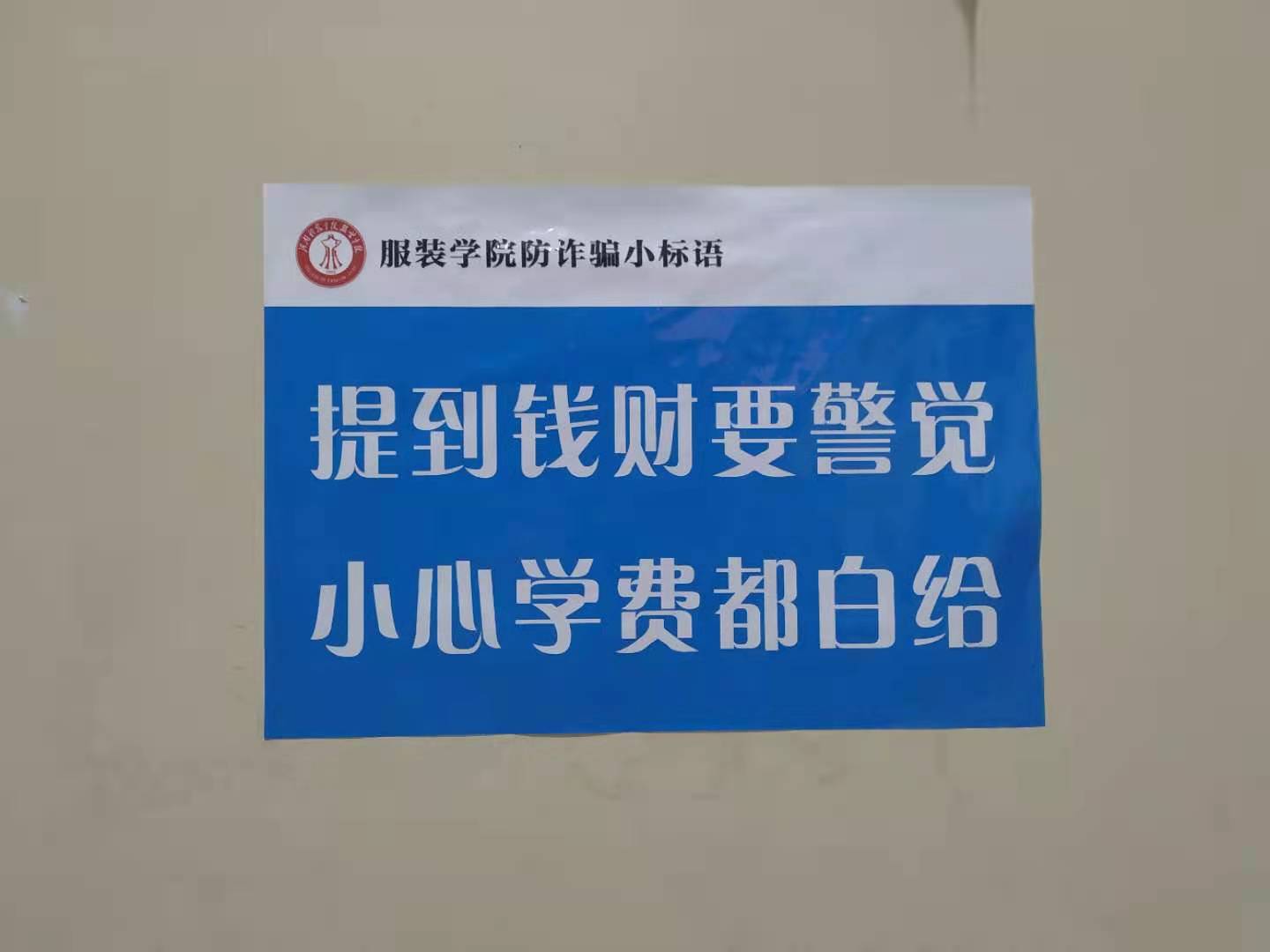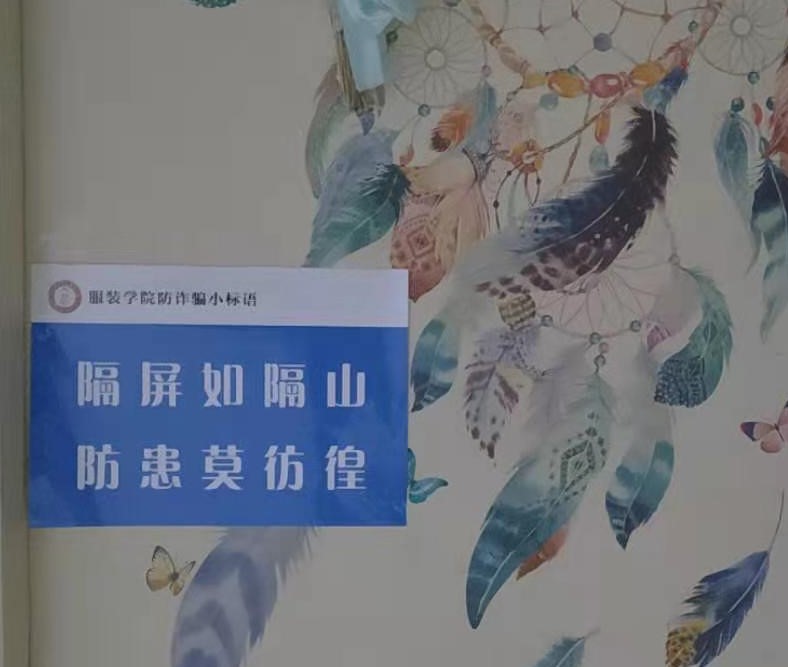 制作宿舍标语是服装学院的传统特色活动之一。通过向全院同学征集防范电信诈骗小标语,筛选出受学生喜爱的标语,张贴在宿舍醒目位置,时刻提醒同学们提高警惕,不给骗子可乘之机。