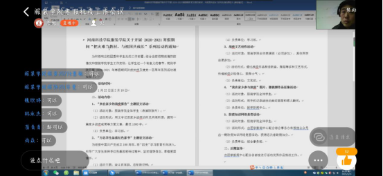 会议主要从四个方面来安排寒假学生工作:一是收集寒假期间抗疫先进事迹并进行宣传;二是积极开展“把灾难当教材,与祖国共同成长”主题教育活动,征集以“来自家乡的抗疫报告”和“万名学生品读红色家书”为主题的优秀文章;三是做好个人防护和健康信息填报,提醒学生及时进行钉钉打卡;四是要求团委、学生会各部门进一步明确负责人、工作人员和实习工作人员的工作职责,按照分工切实做好寒假期间各自分管的工作等。