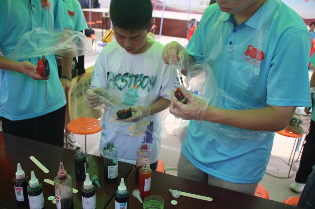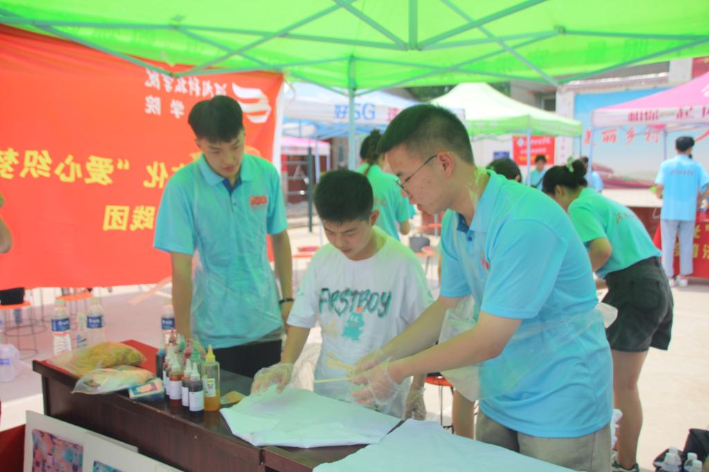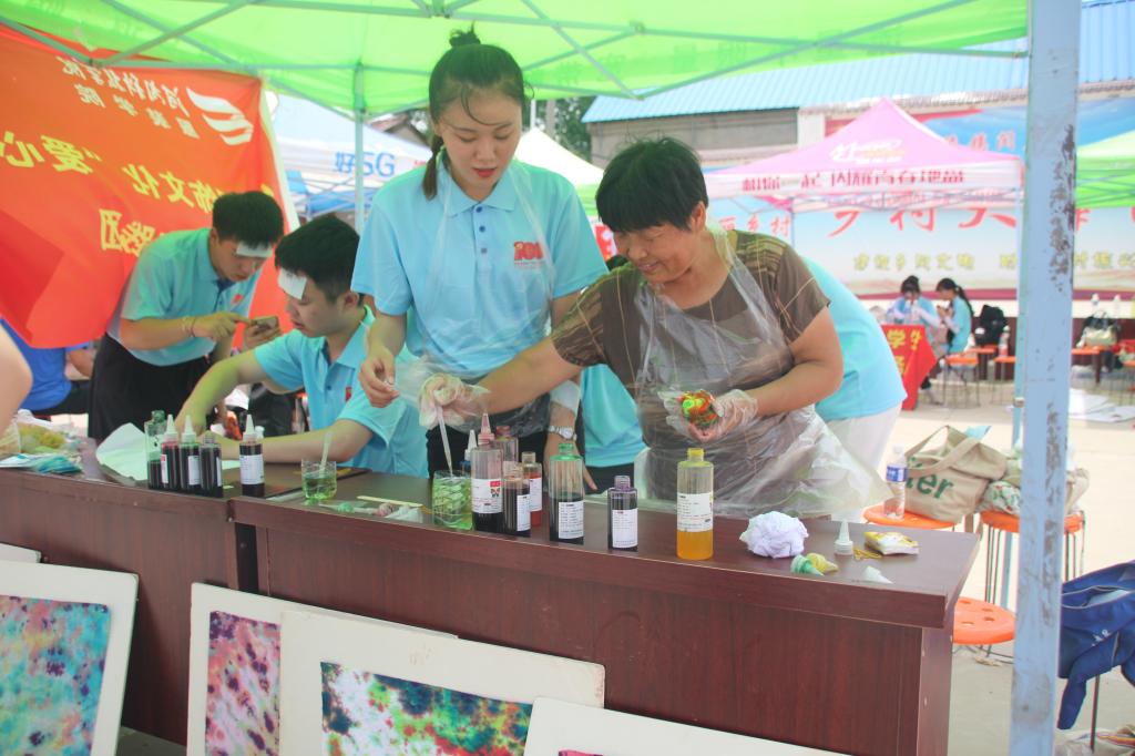 爱心之梦实践团的成员们通过网购购买染料等物品,积极向专业课老师请教,经过精心准备,“传统文化润人心”扎染体验活动在封丘县闫庄正式拉开序幕。团队成员首先为村民们展示了扎染的成品,并给大家讲解了如何扎结和浸染。邀请好奇的村民一起来体验扎染,动手做一份属于自己的扎染作品。待材料上色后,大家解掉扎线,一幅幅独具特色的图案呈现在眼前。一个小小的结扣经过浸染就能出现如此美丽的图案,现场观众纷纷惊叹于扎染艺术的魅力。