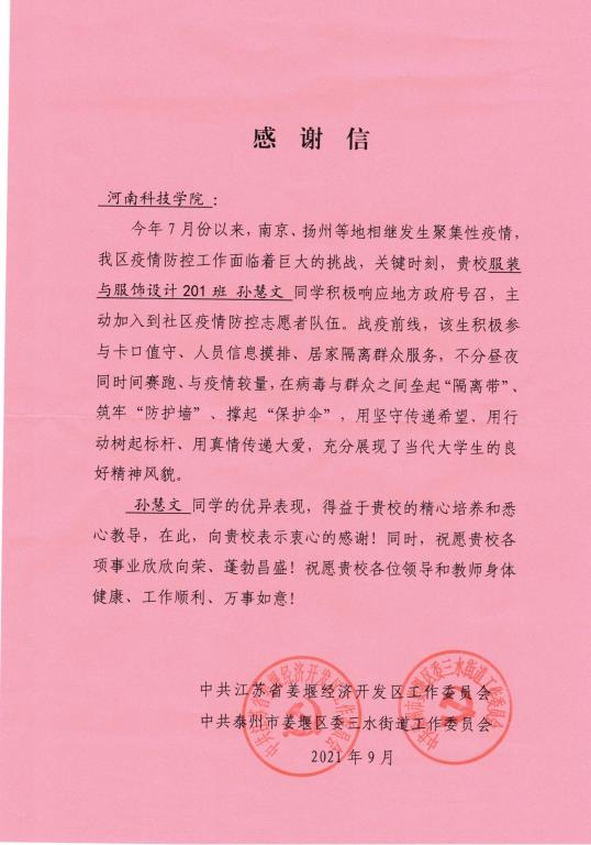 今年7月份以来,南京、扬州等地相继发生聚集性疫情,疫情防控工作面临着巨大的挑战,关键时刻,服装学院服装与服饰设计专业服饰201班孙慧文同学积极响应地方政府号召,主动加入到社区疫情防控志愿者队伍。战疫前线,该生积极参与卡口值守、人员信息摸排、居家隔离群众服务,不分昼夜同时间赛跑、与疫情较量,在病毒与群众之间垒起“隔离带”、筑牢“防护墙”、撑起“保护伞”,用坚守传递希望、用行动树起标杆、用真情传递大爱,充分展现了当代大学生的良好精神风貌。
