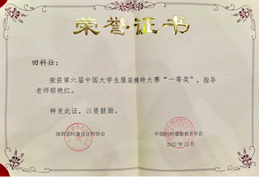 12月29日晚,第六届中国大学生服装模特大赛总决赛暨第七届中国(深圳)国际时装节颁奖盛典在深圳落幕。我校服装学院老师郁艳红指导的服装表演专业2019级学生田科壮夺得本次大赛男模组一等奖。