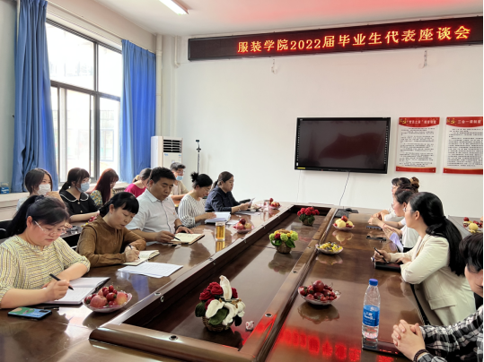 5月29日下午,服装学院在会议室召开2022届毕业生代表座谈会。学院党政班子成员、教师代表和2022届优秀毕业生代表参加了会议。会议由副院长王式竹主持。