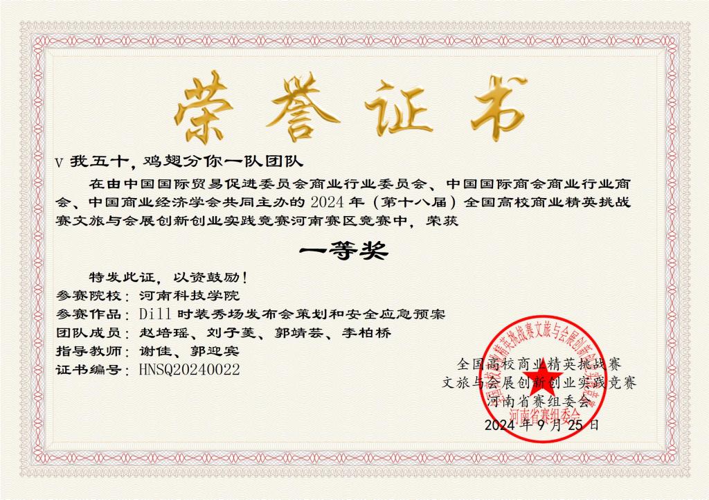 服装学院在郭海燕等教师的组织指导下,共有8个团队报名参加,历时近8个月,经过理论知识赛、校赛、省赛、国赛等层层选拔,最终“正义青年队”及“智慧火花团队”获得大赛会展安全应急沙盘赛道国赛总决赛一等奖、二等奖各一项;“v我50分你鸡翅一队”获大赛会展安全应急沙盘赛道省赛一等奖;“所以爱会消失对不队”获得省文旅短视频赛道二等奖。我校参赛作品整体布局合理、特色鲜明,在排推演应急演练、项目陈述和答辩环节,参赛队员讲解流利、逻辑缜密,获得评委一致好评。
