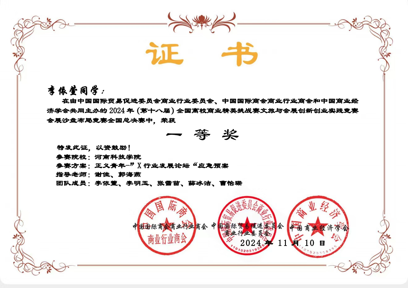 本赛事由中国国际贸易促进委员会商业行业委员会、中国国际商会商业行业商会和中国商业经济学会联合主办的国家级赛事,已连续四年被正式纳入教育部中国高等教育学会“全国普通高等大学生竞赛排行榜名录竞赛项目”名单。本次斩获国赛一等奖是服装学院继2023年荣获国赛二等奖后新的突破,这不仅提高了服装专业学生的实践能力和专业素养,更是学院尝试跨学科实践的一次重大突破,充分显示了服装专业以“专业+跨界+创新创业能力”为特色的教学模式在应用型人才培养教学改革上取得的成果。