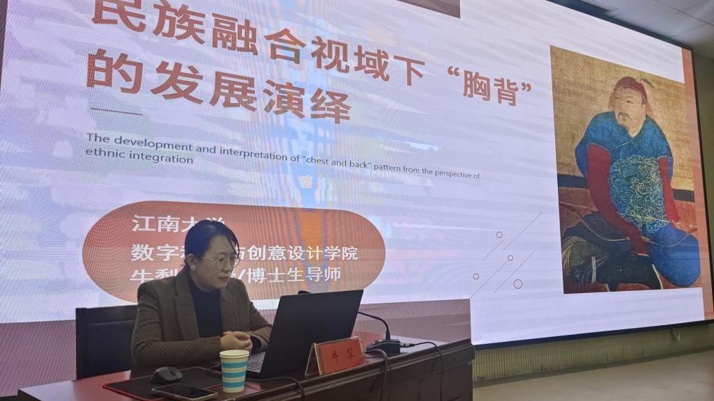 3月22日下午,服装学院邀请江南大学数字科技与创意设计学院副院长、博士生导师牛犁教授在图书馆一楼报告厅举行题为《民族融合视域下“胸背”的发展演绎》的学术报告。报告会由院长商亚敏主持,学院领导班子、全体教师、研究生及200余名本科生参加了报告会。