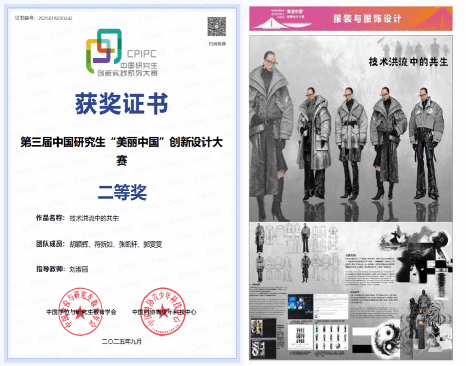 近日,第三届中国研究生“美丽中国”创新设计大赛在哈尔滨举办。由我院刘淑丽、王式竹、郭海燕导师指导,胡颖辉、符新如、张凯轩、郭雯雯四位研究生参加的服装设计作品《技术洪流中的共生》,荣获全国二等奖。
