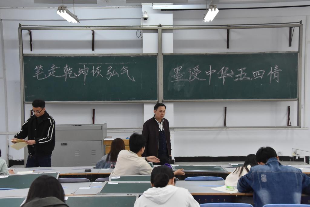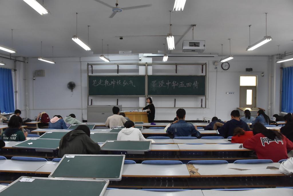 4月11日中午,数学科学学院在九合一教室和三楼会议室进行了“笔走乾坤恢弘气,墨浸中华五四情”三笔字大赛决赛,辅导员贾普君观看了比赛。