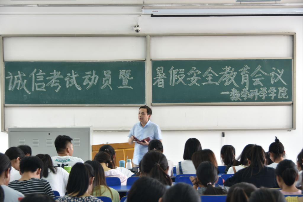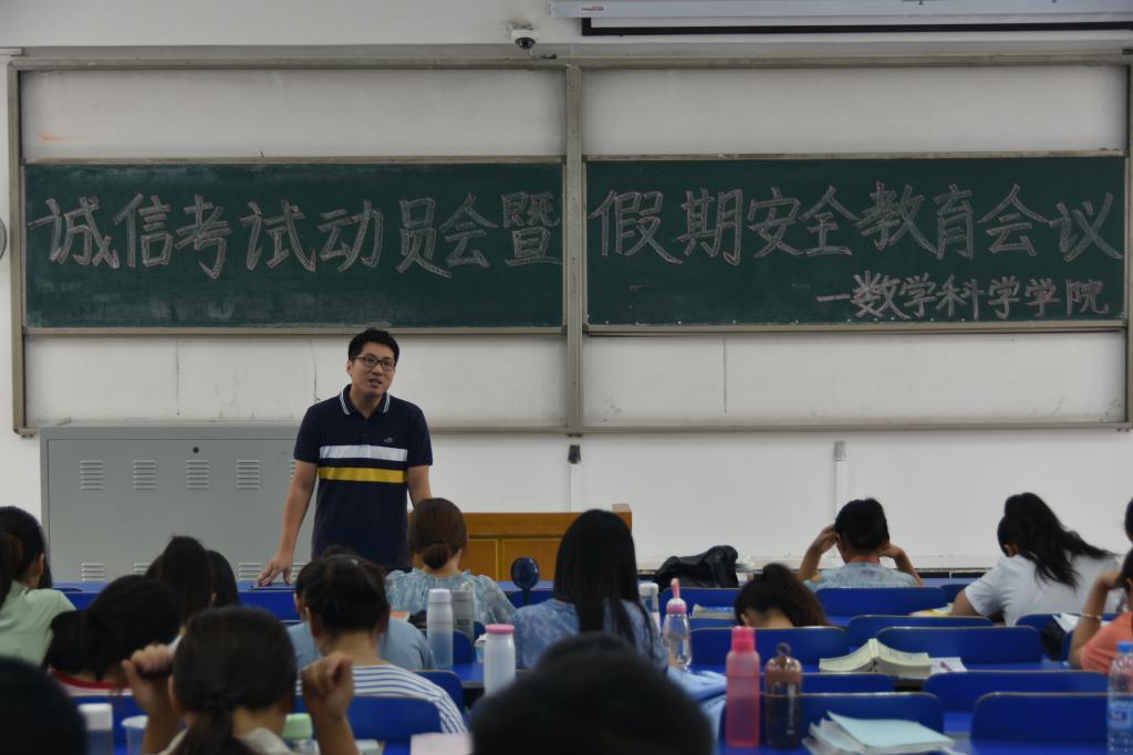 为加强诚信教育,培养优良学风和考风,同时落实假期学校对学生安全教育及管理工作方面的要求,6月27日上午,数学科学学院分年级召开诚信考试动员会暨假期安全教育会议。