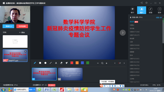 2月19日中午,数学科学学院召开新冠肺炎疫情防控学生工作专题视频会议。学院辅导员、全体学生干部和联点班级党员270余人参会,会议由数学科学学院团委书记贾普君主持。